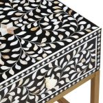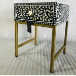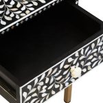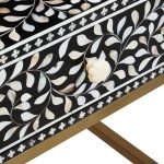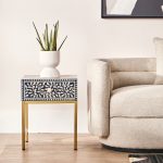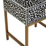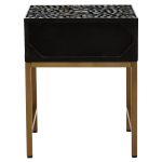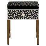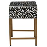 This one drawer side table with hand laid white mother of pearl detail will add style and character to a traditional or boho space. Fusion-Drawer-Side-Table-Black-Wood-White-Bone-Gold-Legs-Funriture-Home-Living-Accessories-Sturdy-Modern-Design-Tableware-Servware-Storage-Contemporary Every detail has been carefully considered to invite relaxation and elevate your interior with effortless sophistication.
