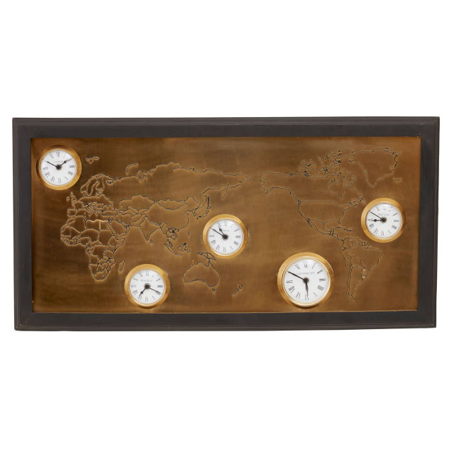The Hemel map wall clock features a map and five different clocks, each featuring a different time zone. Every detail has been carefully considered to invite relaxation and elevate your interior with effortless sophistication.