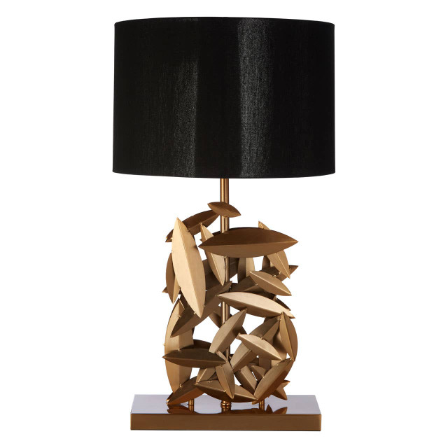 The Zirona table lamp is a contemporary accent piece for modern interiors with its abstract gold finished metal base and black linen shade. Every detail has been carefully considered to invite relaxation and elevate your interior with effortless sophistication.